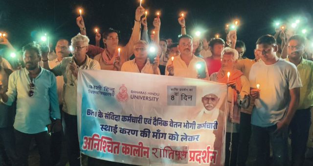 काशी हिंदू विश्वविद्यालय (BHU) में संविदा और दैनिक वेतनभोगी कर्मचारियों का स्थायीकरण की मांग को लेकर चल रहा अनिश्चितकालीन शांतिपूर्ण आंदोलन आठवें दिन और तेज हो गया। कर्मचारियों ने बुधवार को मधुबन परिसर में कैंडल मार्च निकालकर प्रशासन के खिलाफ अपना विरोध दर्ज कराया।