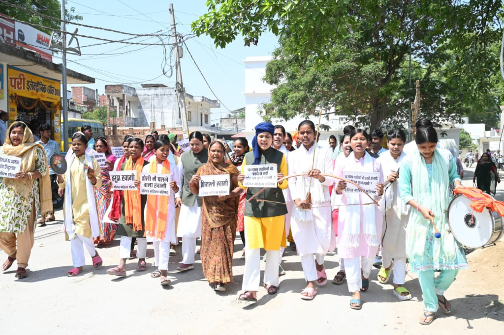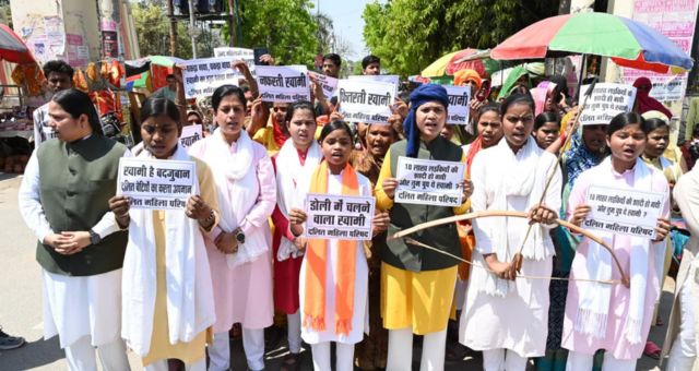 दलित महिला परिषद की नेता खुशी रमन के नेतृत्व में महिलाओं ने मुंशी प्रेमचंद स्मारक से प्रेमचंद स्मृति द्वार (Varanasi) तक आक्रोश मार्च निकाला। हाथों में तख्तियां और ड्रम की आवाज के साथ महिलाओं ने “स्वामी ने झूठ बोला” और “स्वामी के खातों की जांच हो” जैसे नारे लगाए।